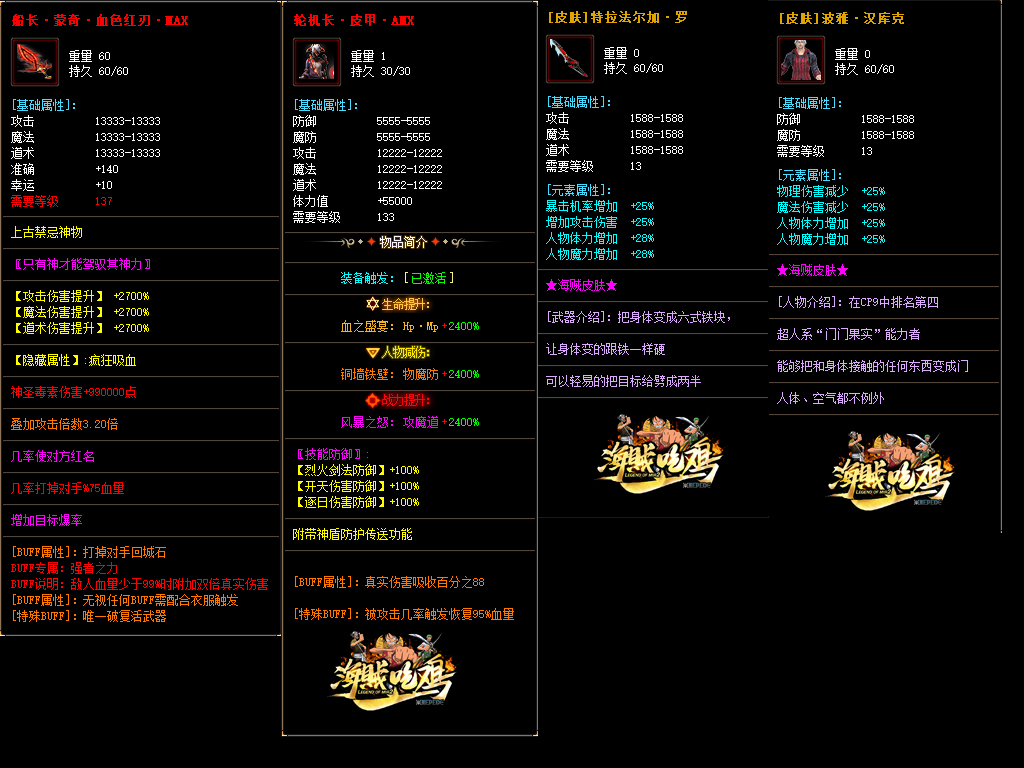 - 【游戏介绍】:|《新海贼吃鸡》礼包全部重新改!降低装备元素属性,优化PK,取消所有破复活BUFF,还原最初的pk,优化pk属性